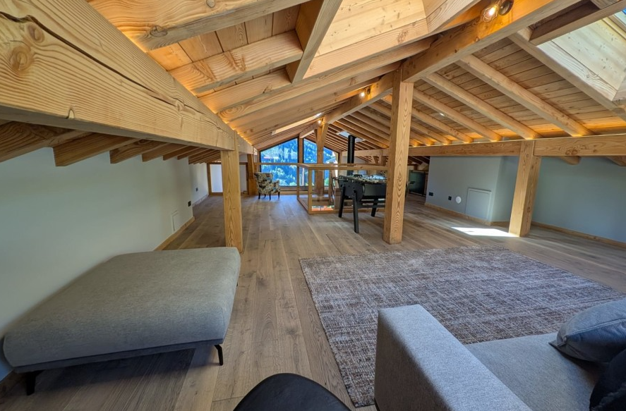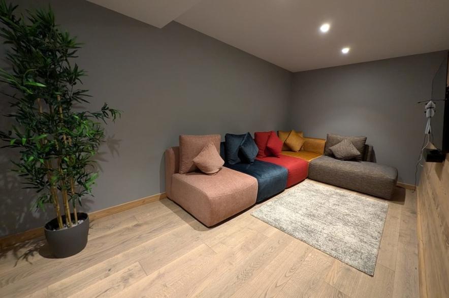The double aspect open plan lounge/dining area with a large central fireplace, flat screen TV and Sonos system makes Chalet Sika perfect for families and groups to relax. And with the addition of the huge 60m2 (floor area) mezzanine above with comfortable seating as well as a bistro table football, it’s the perfect chalet for large groups to all relax and have fun. There is also a bonus room downstairs with comfy relaxed seating to watch a movie or play on the PlayStation 5 – a perfect escape for kids.