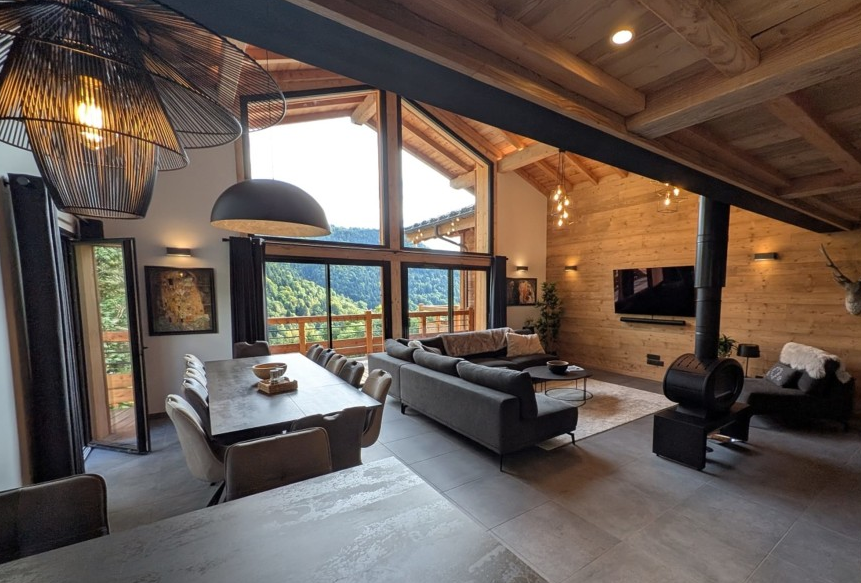 This stunning privately owned south facing chalet is rented Sunday to Sunday and has been luxuriously furnished with a sophisticated style that gives Chalet Sika a relaxed yet chic vibe. The open plan living area with huge windows overlooks the valley beyond and provides the perfect view. Being south facing the sun hits the slopes and offers the perfect spot to watch the sun set from the wrap around balcony.