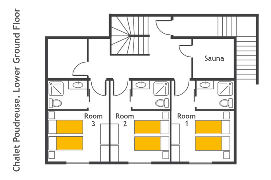 Chalet Poudreuse has 6 good-sized en-suite bedrooms over two floors, each one with a shower and one room has a bath to soak in too. Five rooms have twin beds that can be made up as doubles; please request at booking. One room has a twin/double bed and a bunk bed (suitable for smaller adults). All rooms have smart TV’s with usb ports. The first floor is a spacious, vaulted, living area. With an open-plan kitchen-diner and lounge area with a flatscreen smart TV with usb port (use your own account or device and cable), DVD player and music system, fireplace (modern log burner) and a balcony boasting panoramic views of the slopes and stunning sunsets. The chalet has a ski room with boot warmers too. To help relax and revive for a great day skiing there is a sauna on the lower ground floor, the bedrooms on this floor have natural light and ventilation but no view.