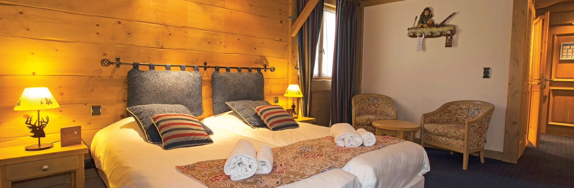 Warm, cosy guest rooms with embroidered fabrics and carved wood furnishings welcome you. An option of twins, doubles, interconnecting and family bedrooms are available all with balconies overlooking the slopes.