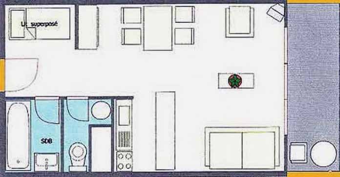 Type E studios - sleep 1-6: Living area with 2 single sofa beds and 2 cabin areas with bunk beds.