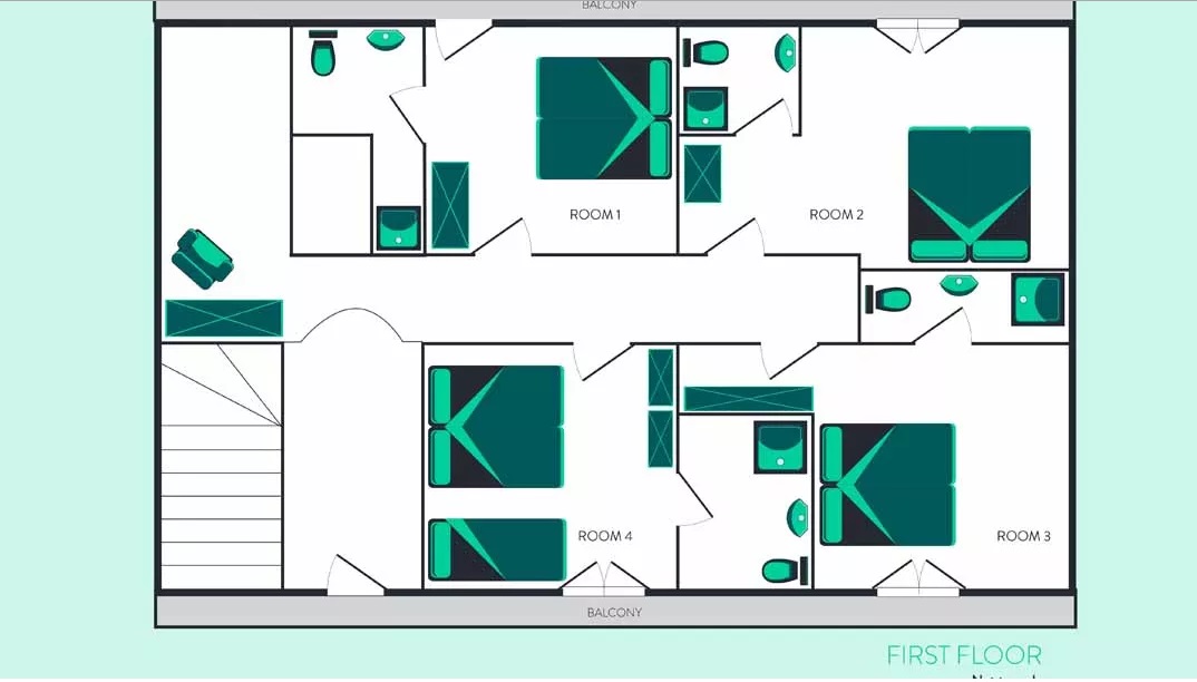 first floor: Three twin rooms with en suite shower and WC (1, 2, 3). One triple room with twin beds and a single bed, en suite shower and WC (4).