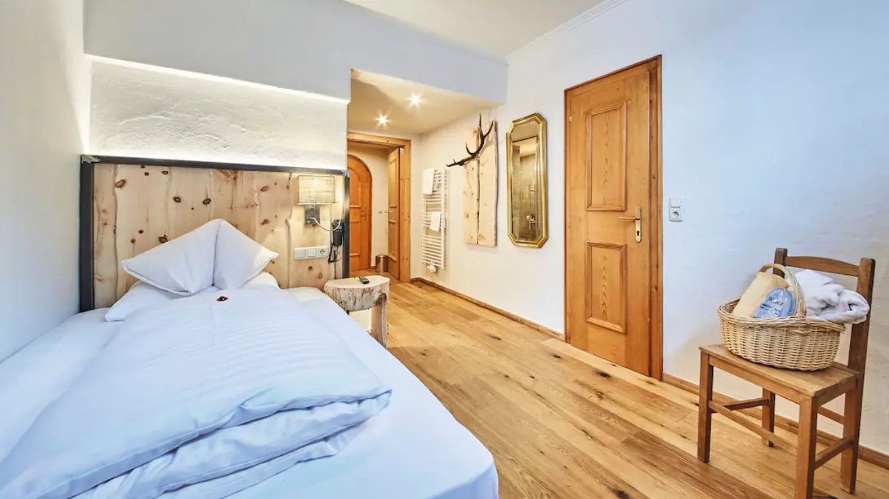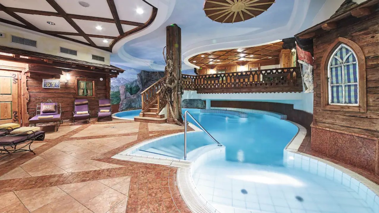 The facilities are also pretty special. The wellness area is beautifully decorated to look like an alpine village, with a lodge, chapel and painted mountain murals on the walls. You can take a refreshing swim in the pool or visit any of the three types of sauna – there’s even a separate kids’ pool. Plus, for an extra charge, you can choose from a range of massages and treatments to really soothe those ski muscles.