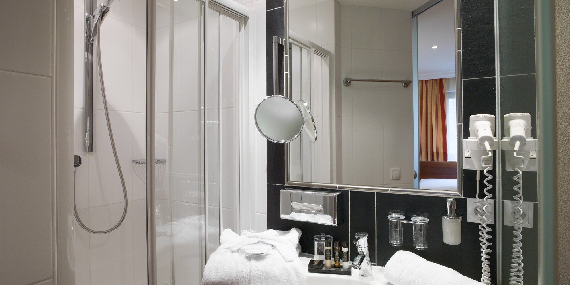 Single rooms have a single bed (but a large one), the bathrooms have a shower and toilet.