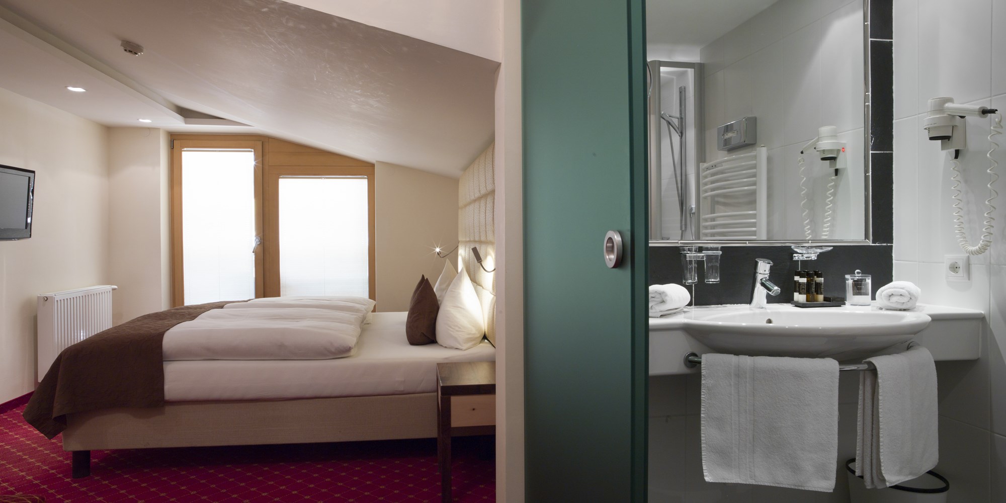 The attic rooms have Austrian twin beds as well as a sofa bed. The location is great with a small terrace. There's a bath tub and toilet as well as two TVs, mini bar and high quality furnishings.