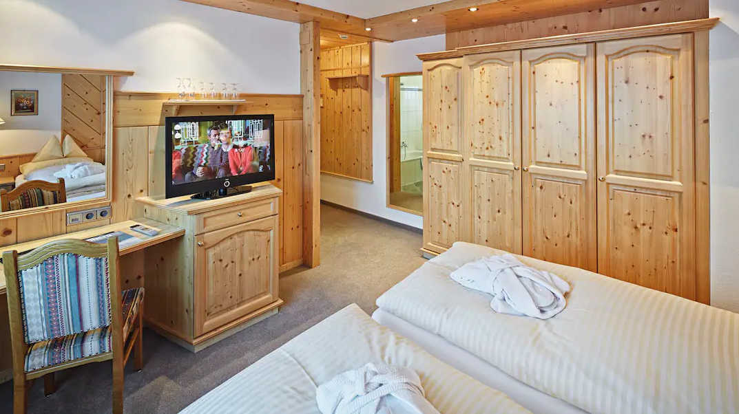 Twin room – sleeps 2-3: Austrian twin beds, extra single sofa bed when booked for three people, private bath, WC and north-facing balcony.