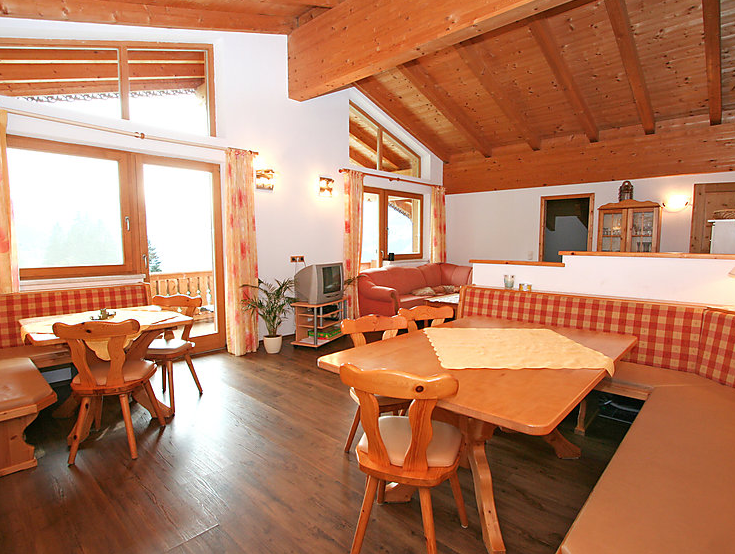 7-room apartment 180 m2, on the top floor. Spacious, comfortable and tasteful furnishings: entrance hall. Large living/dining room with dining nook and satellite TV. Exit to the balcony. 5 double bedrooms. 1 room with 2 double beds. Open kitchen (oven, dishwasher, 4 ceramic glass hob hotplates, microwave). Bath/shower, shower, 2 sep. WC's. Wooden floors. Comfortable furnishings in the country house style. Balcony. Balcony furniture. Marvellous panoramic view of the mountains and the countryside. High ceilings, visible beams.