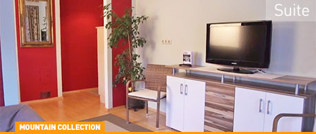 Suites (2-5 people): These spacious, apartment-style Suites have 2 bedrooms (one with an Austrian twin bed, and the second with either bunk beds or a single bed), bathroom with bath, shower & wc, and a large open plan kitchen/lounge/diner with double sofa-bed and wrap-around balcony. The Suite with the single bedroom also has a large roof terrace.