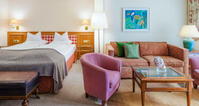 Suite (approx. 37m²) - sleeps 2-4 (max 3 adults or 2 adults and 2 children up to 11 years): Austrian twin beds, extra double sofa bed when booked for three or four, private bath, WC and balcony.
