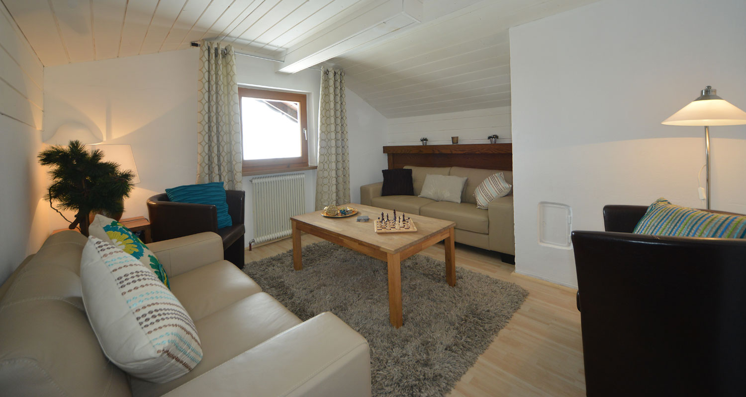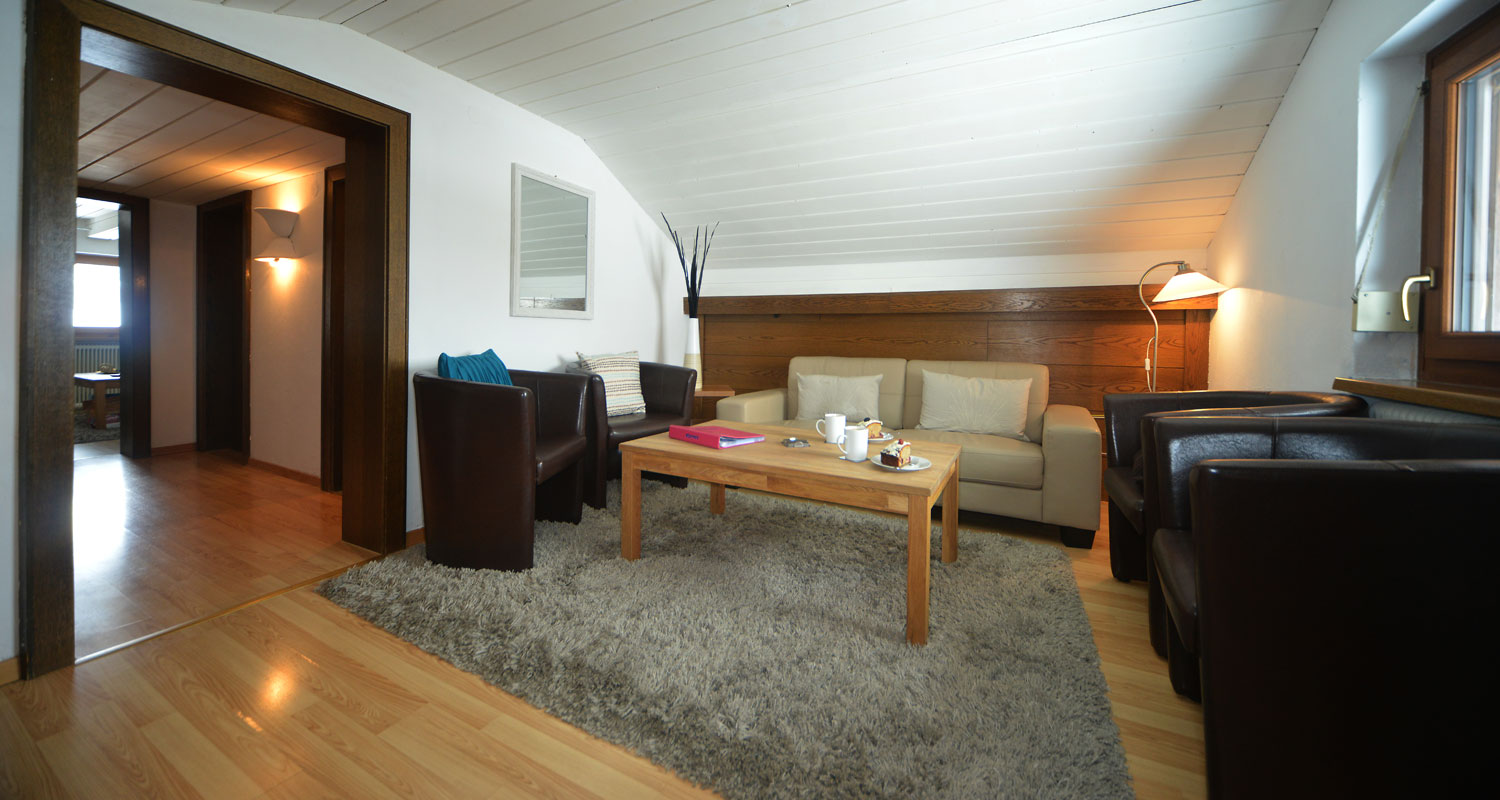 The dining-room on the ground floor provides an ideal setting for adult dinner in the evenings, and can be a little snug at breakfast time when we have a full house! The separate lounge is up on the top floor, with quirky ‘hobbit-size’ doorway and sloping ceilings. Like the comfortable family suites themselves, the dining-room is furnished in traditional Tyrolean style.