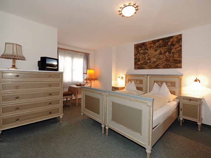 for 2 people on half board sharing a room with Austrian twin beds, private shower and WC. Superior rooms sleeping up to 4 people, (max. 3 adults or 2 adults and 2 children) are available at a supplement. All bedrooms have cable TV, hairdryer, fridge, safe and are non-smoking.
