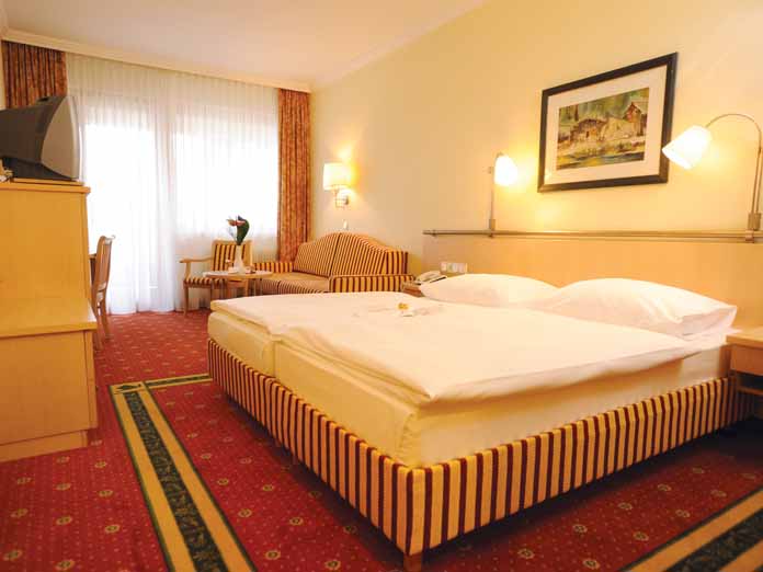 for 2 people on half board sharing a room with Austrian twin beds, private bath, WC and balcony. Rooms sleep up to 4 people with Austrian twin and double sofa bed. Single rooms are also available at a supplement. All bedrooms have cable TV, minibar, internet link, safe, bathrobes and balcony.