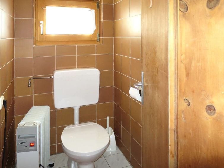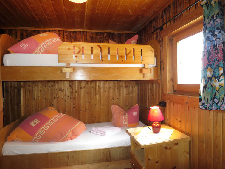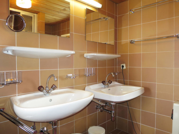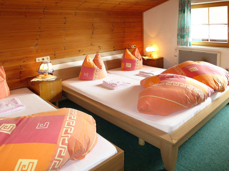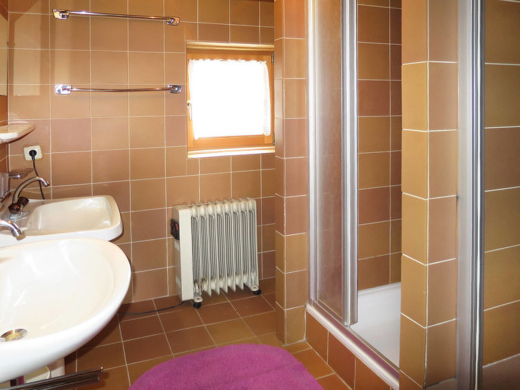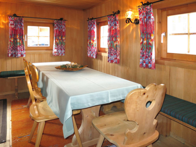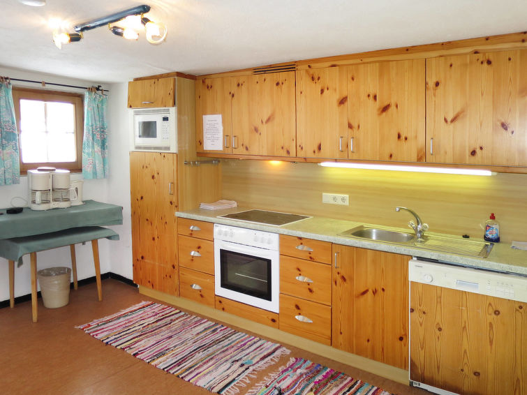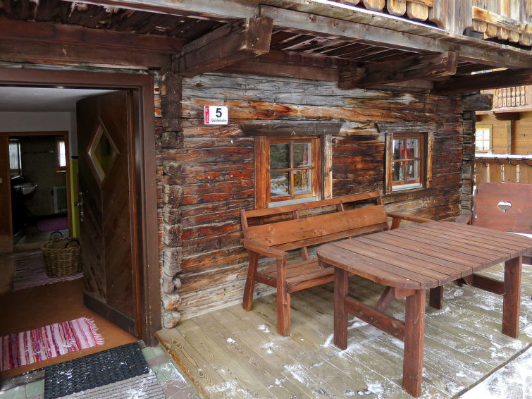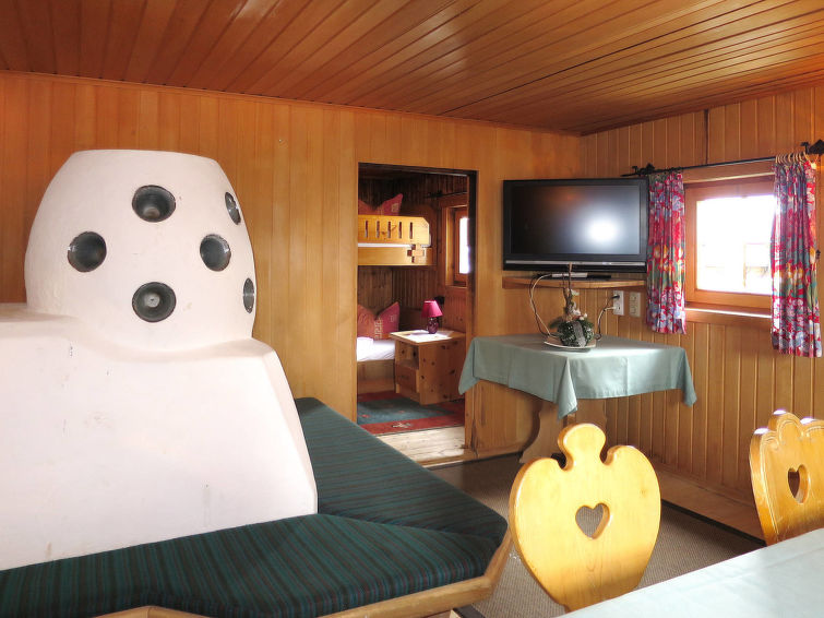 detached house, 8 - 11 people, 5 room/s, 4 bedroom/s, 1 bathroom/s, approx. 100 m², 2 floor/s. Feature: alpine hut. Furnishing: rustic, with much wood, wooden floor, carpet. stairs (steep, narrow). Equipment: satellite TV; internet access Wi-Fi (included); wood stove (in the living room); electric radiators. Room layout: Living room/lounge(ground floor): tables, chairs, benches, tiled stove. Dining area: in the living room. Kitchen: separate (ground floor). Kitchen/ cooking equipment: 4 ceramic hobs, oven, microwave oven, dish-washer, refrigerator, coffee machine. Bedroom 1(ground floor, small room): bunk bed. Bedroom 2(floor 1): 2 x single bed. Bedroom 3(floor 1): double bed, single bed, exit to balcony. Bedroom 4(floor 1): double bed, single bed, exit to balcony. Sleeping accommodation 5(floor 1): single bed in the corridor/entrance hall. Sanitary 1(ground floor): double washbasin, shared shower room with 2 showers. Sanitary 2(ground floor): separate WC.