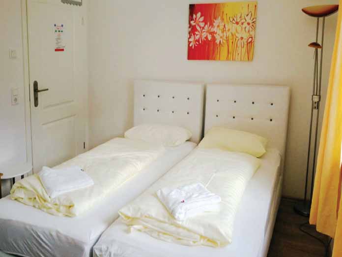 Twin Family Room – sleeps to 2-4 (max 3 adults): Austrian twin beds, extra double sofa bed, private bath (with shower attachment), WC and balcony.