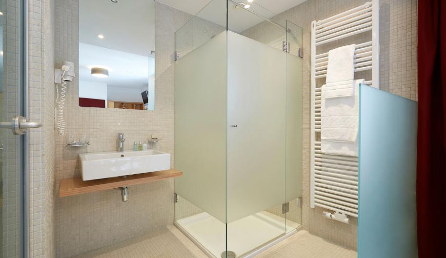Open plan facilities are common in Austria and is where the shower and sink are visible within the room. The toilet is in a separate cubicle behind a frosted glass door.