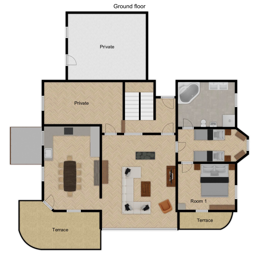 On the ground floor, there is a spacious living room offering stunning views. The living room includes a cosy seating area with a fireplace and a large flat-screen TV, ideal for gathering with friends or family to discuss the day. While you unwind, your chalet hosts will be preparing a three-course dinner in the kitchen. This separate space, adjacent to the living room, also includes the dining area where your three-course meal will be served by the chalet hosts. The open kitchen layout makes it easy to interact with the hosts. After dinner, feel free to relax at the table or sink back into the sofa. On this floor, you will also find the master bedroom – a double room with an ensuite bathroom and jacuzzi bath. This room can, if desired, be converted into a four-person room.