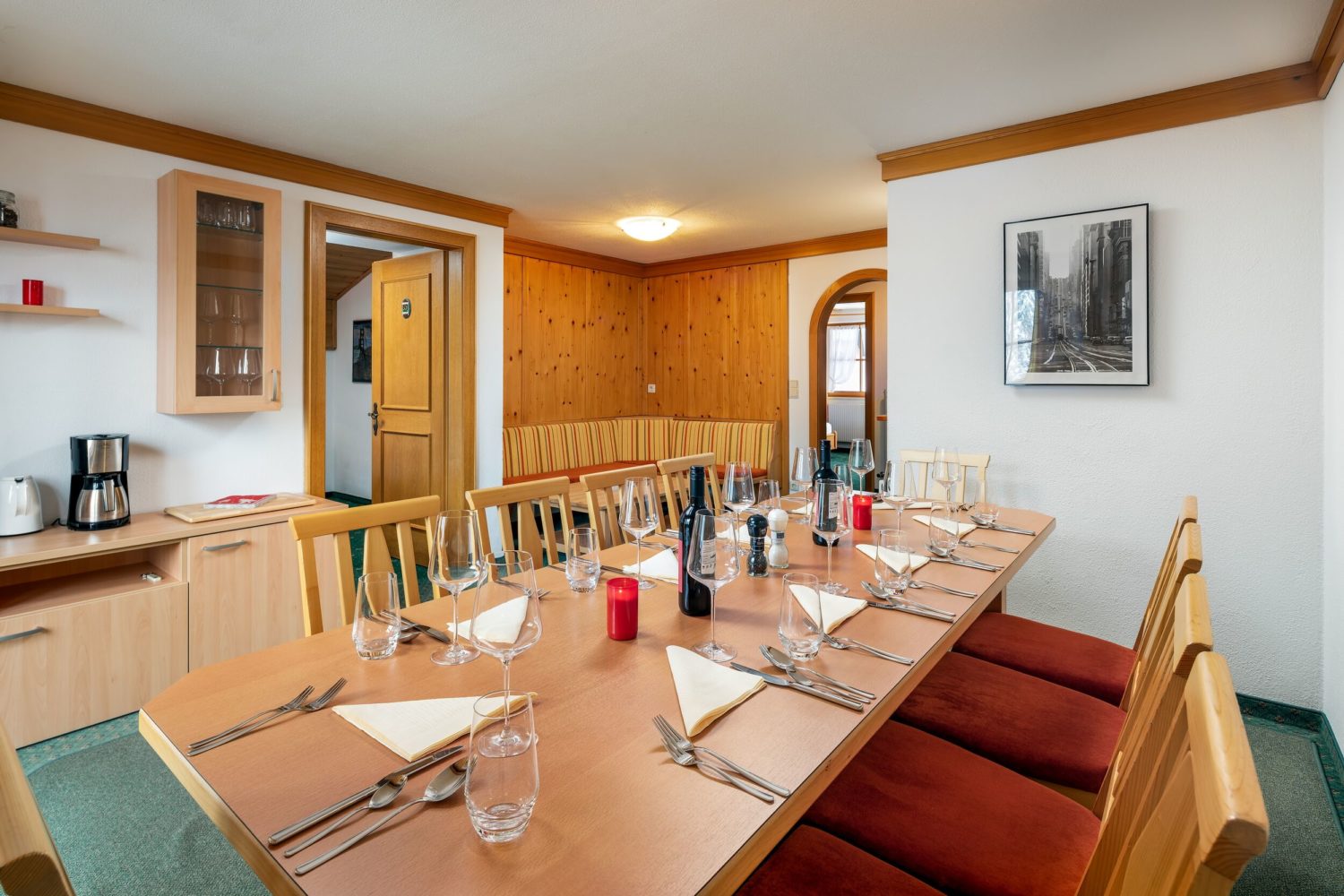 Ski-in/ski-out chalet, directly on the blue piste. The chalet is in a fantastic piste side location, situated just above the village on the side of the Galzig, it is a blue run down to the Gampen and Galzig lifts and 100% snow sure till the end of April. St Anton isn’t known for its choice of slopeside chalets but if that is top of your priorities then this is the chalet for you. Ski back to the chalet at the end of the day and store your skis in the heated ski room with boot dryers/warmers. To the dismay of the chalet staff and the untouched afternoon treat, the lively and very popular Mooserwirt and Krazy Kanguruh are virtually on the doorstep, both great venues to end your days skiing that truly have to be experienced to be believed (these bars close by 8pm so they won’t disturb your evening). The resort is about a 8/10 minute walk down the piste, and not much longer if you opt for the road. Coming back up from town, you can take the local bus (free ski bus during the day or night bus with fare) which stops just a couple of minutes walk from the chalet. The chalet is situated in a tranquil location at the end of a private cul de sac and hardly any traffic. Chalet Aurora is a comfortable St Anton chalet that sleeps up to 12 people in five spacious bedrooms, one of which is a self contained ensuite studio. There is a dining room with flatscreen TV and the advantage of a separate living room with flatscreen TV which is comfortable and cosy and offers a great place to relax. Park your car for free at the chalet. Your chalet staff live out, so your privacy is completely guaranteed. The very kind owner lives in a self-contained apartment on the middle floor and she asks kindly to stop loud partying after 10.30pm. No problem is a normal cosy noise level.