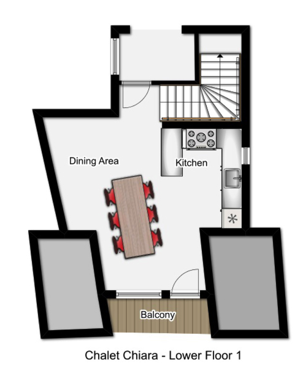 The chalet has an open plan kitchen / dining room and benefits from a separate sitting room, so you can sit and relax in the sitting room over canapes and aperitifs whilst your chalet staff finish off their preparations for your dinner and again enjoy a coffee after dinner whilst they tidy away. The six bedrooms are all ensuite and all have balconies.