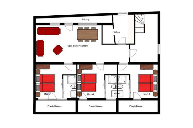 High-quality furnishings- The open plan living/dining area features plenty of comfortable soft seating for up to six people, mainly thanks to a large L-shaped sofa. There is direct access to a balcony, and the beautiful dining table can seat six people as well. For ultimate convenience, all the stylish bedrooms are en suite with immaculately fitted bathrooms and all benefit from a private balcony or terrace. The chalet shares an entrance lobby.