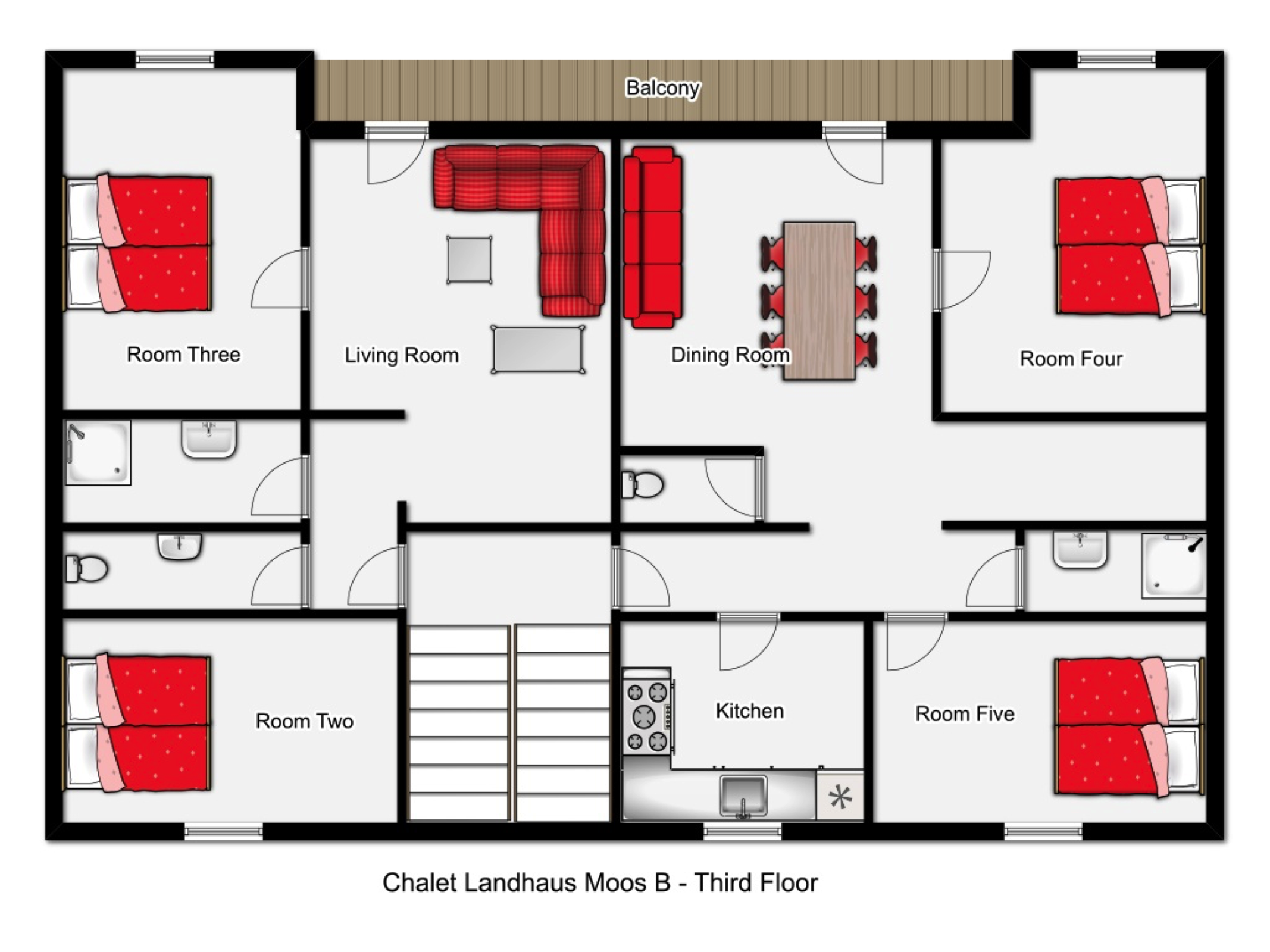 The chalet has five spacious bedrooms, one of which is a self contained ensuite studio on the ground floor with the option of a third bed. The rest of the chalet is on the upper floor, there is a dining room and the advantage of a separate living room which is comfortable and cosy and offers a great place to relax over a slice of cake and cup of tea or to enjoy your canapes and aperitif.