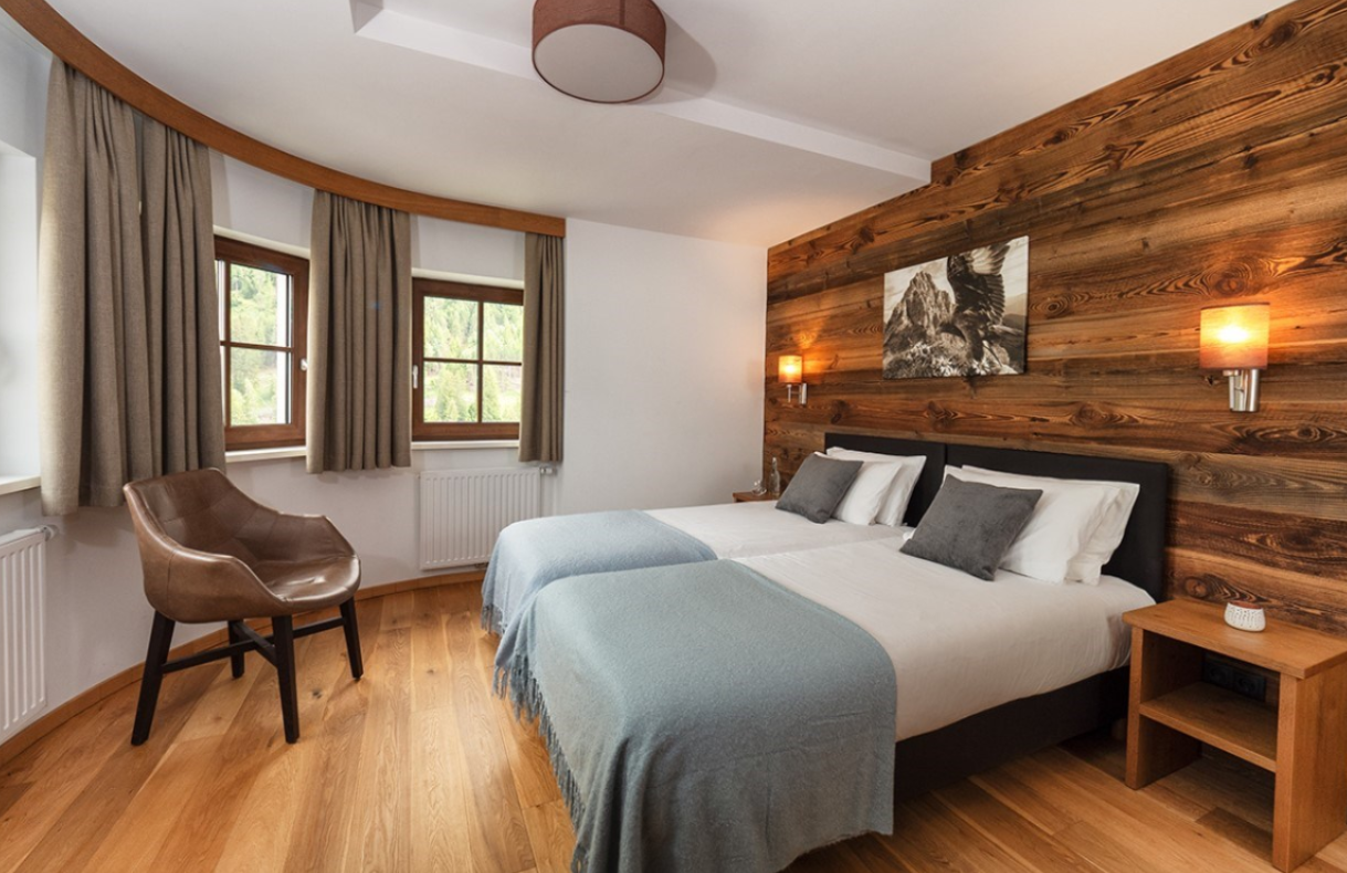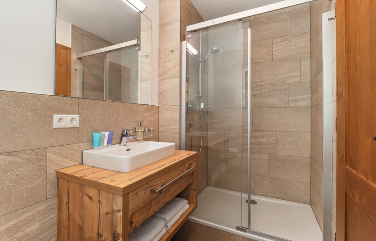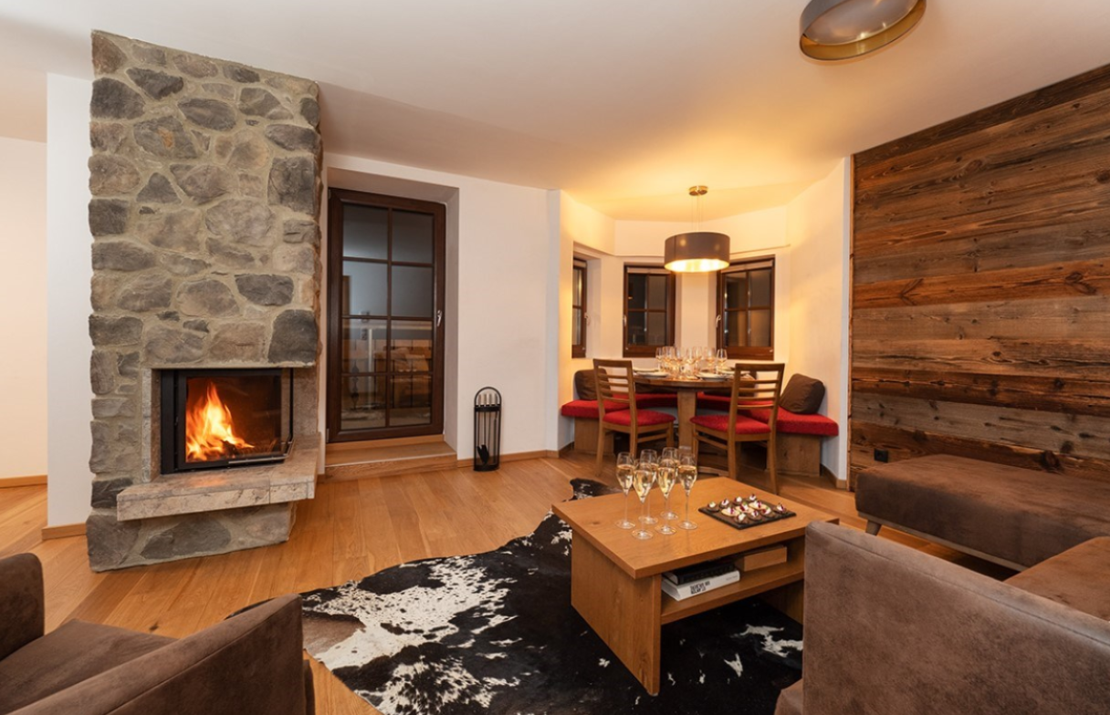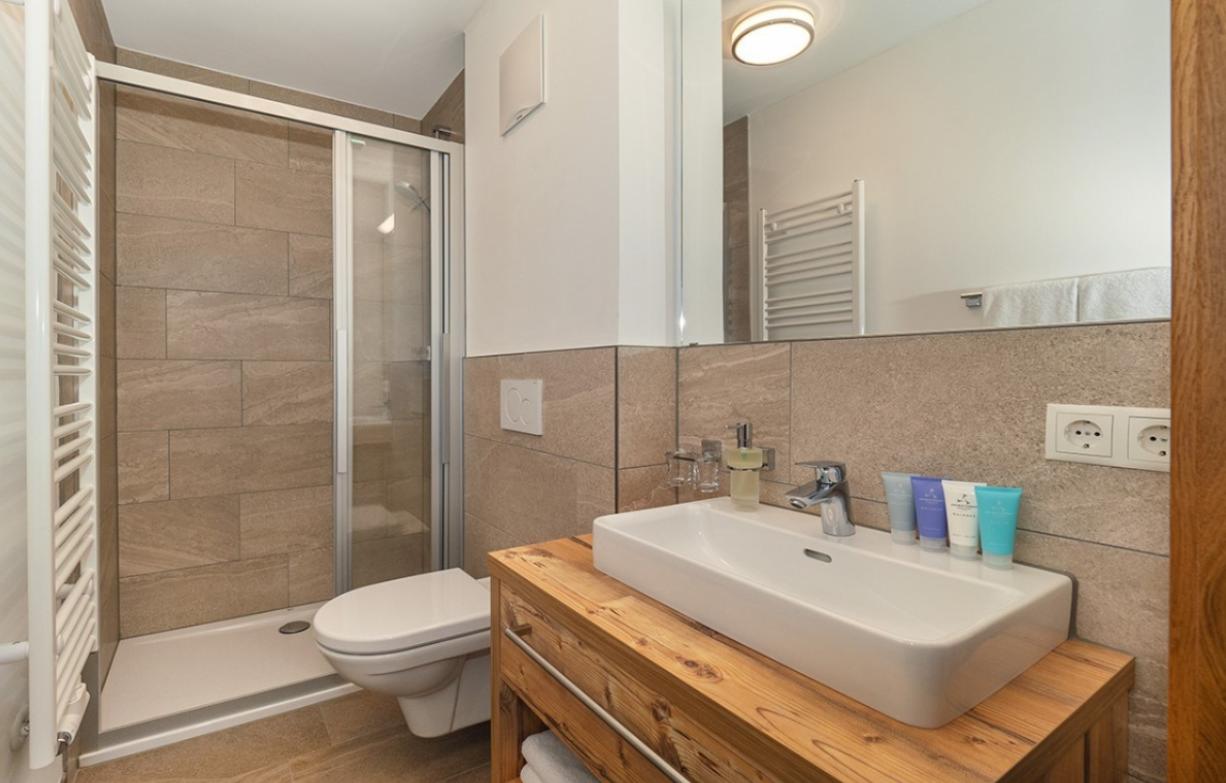 The chalet is a self-contained duplex apartment on the ground and first floors. The open plan living dining room, with log fire, offers the ideal space for six family or friends to relax, with a balcony providing views over Rendl to the South. The three spacious bedrooms upstairs all have en suite shower. Of course, you will have a dedicated chalet host to serve breakfast, afternoon tea and a 3 course meal on 6 evenings. For guests’ convenience, a chauffeured vehicle service runs to and from the piste daily until 8pm.