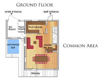 • Common Area, Kitchen, Cocktail Bar, Lounge, Ski Room, Commercial Spa & Balcony