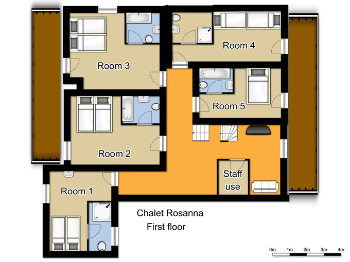 The bedrooms are charming with pretty painted bedsteads and wardrobes adding to the character and warmth; all are en suite, either with bath or shower and most have a balcony. The split level living and dining areas have an appealing ambience with a cosy corner fireplace, an inviting spot in which to relax at the end of your ski day.
