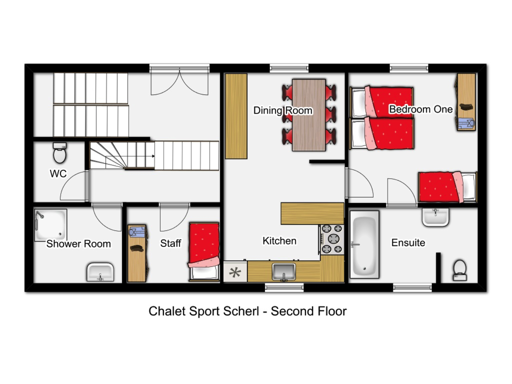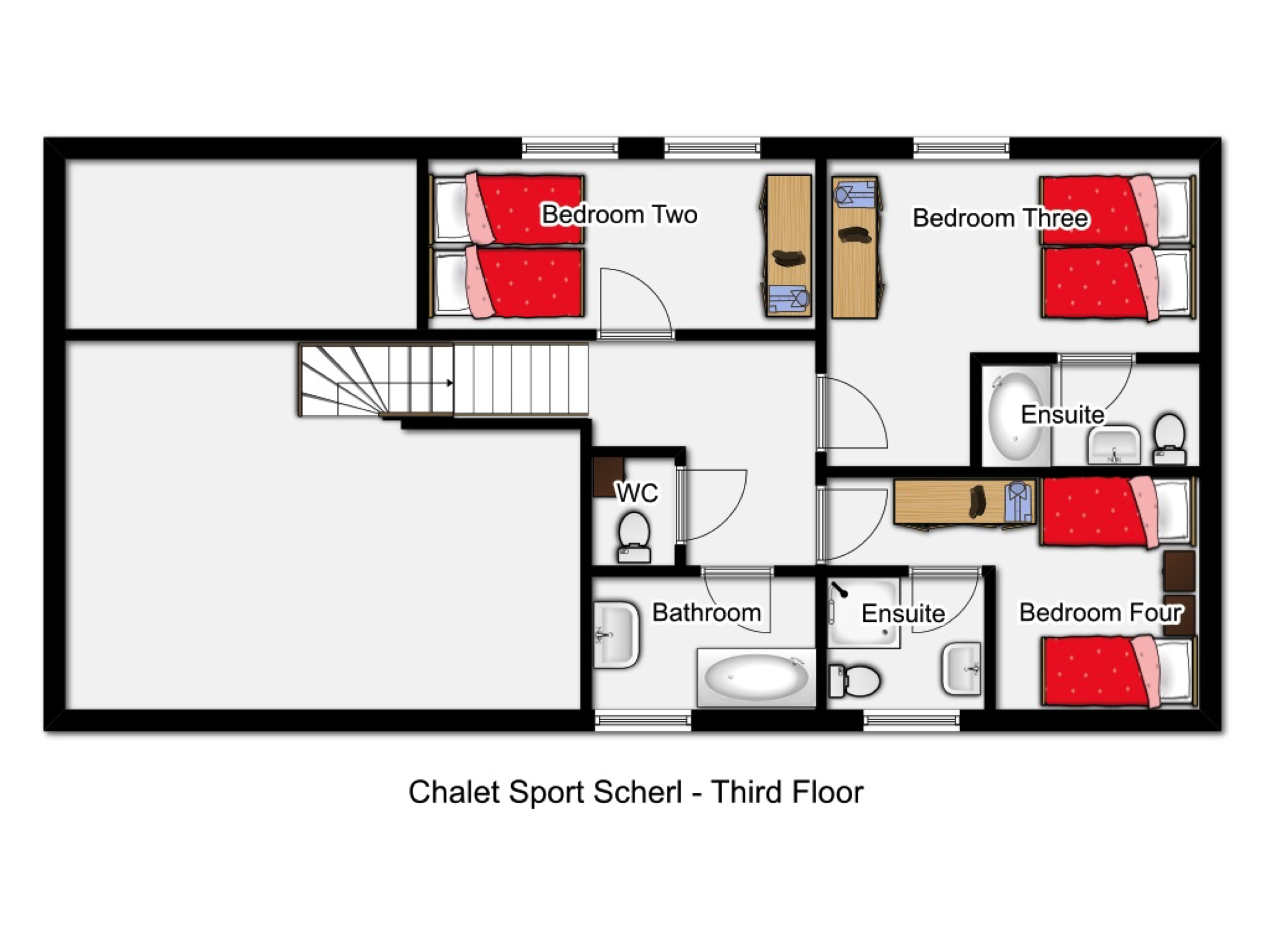 Bedrooms are all a good size with modern furnishings and decor and all are either ensuite or have private facilities. A lack of separate sitting room has detracted somewhat from this great chalet and whilst impossible to create, the owner is carrying out some improvements this Summer (2014). Plans are to adapt the current dining area with more comfortable and improved built in seating and remove fitted units to create more space. In addition, there will be a snug area with small sofa and tv in the open plan hall.