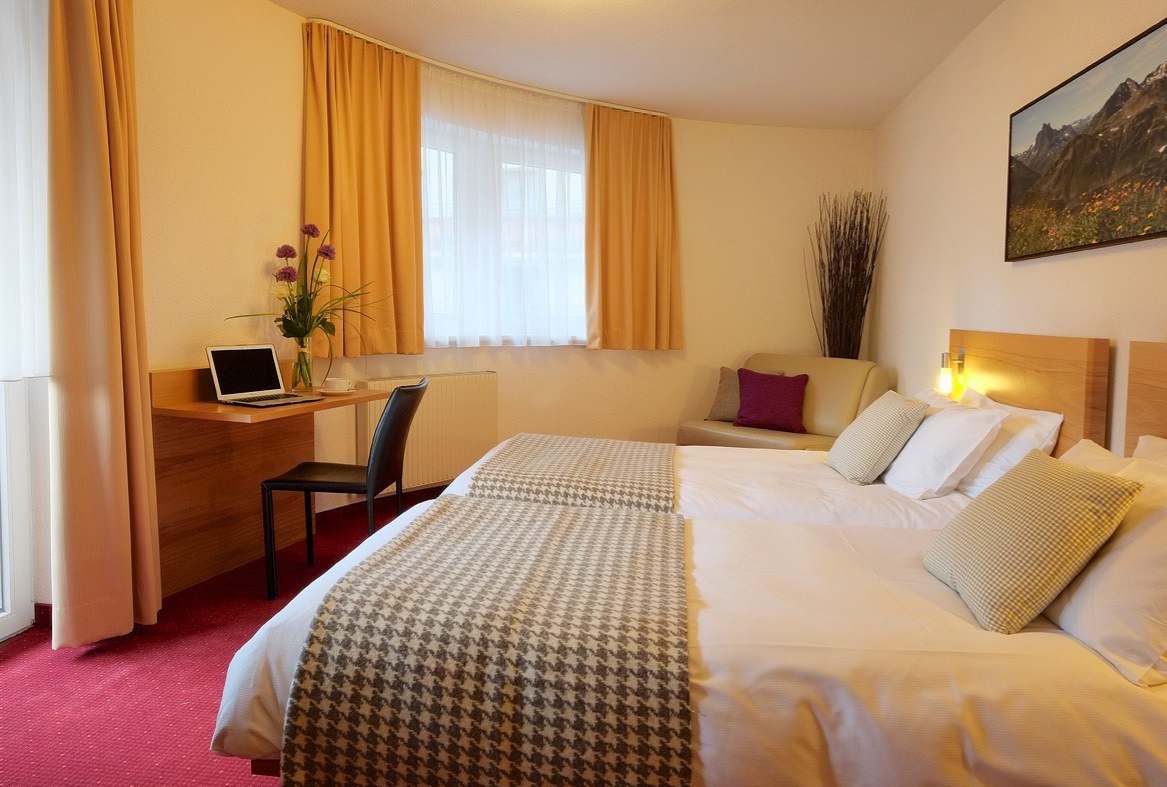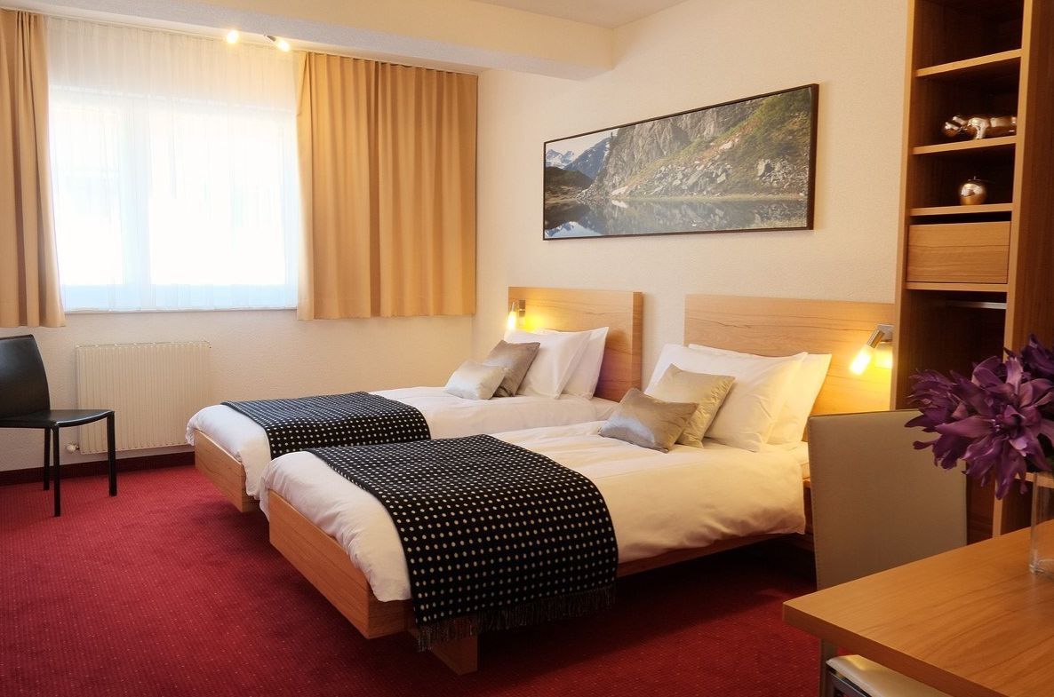 Double/Twin with additional bed, balcony, en suite bath, handbasin and WC. (Sofa bed pay half adult price). Space for cot.