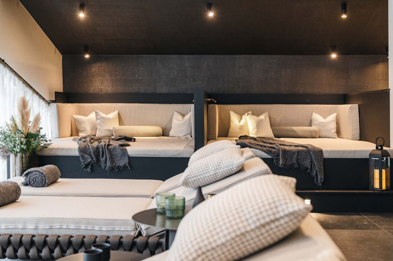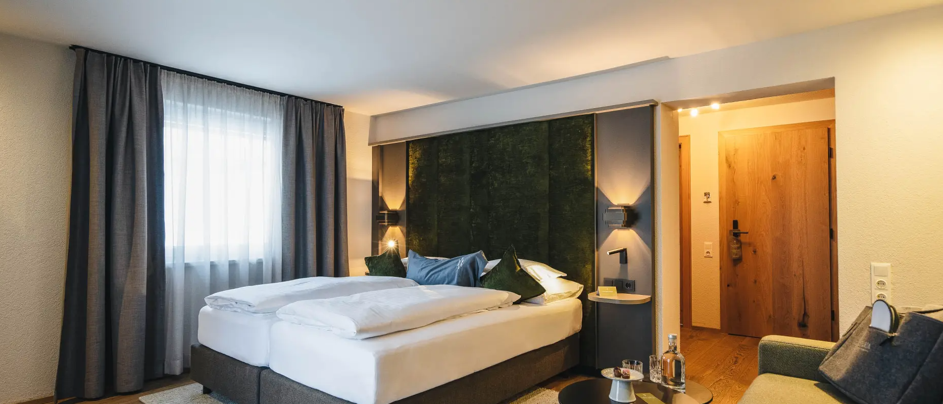 The 41 m² Mountain Junior Suite offers a separate living and sleeping area, ideal for 2 to 4 people. With wooden floor, box-spring bed, and a bathroom with rain shower and separate WC. The balcony offers a wonderful mountain view and views over St. Anton. Equipped with Smart TV, safe, hairdryer, make-up mirror and ARPURIA amenities. The renovated living area has a pull-out sofa, perfect for additional guests, surrounded by high-quality local materials.