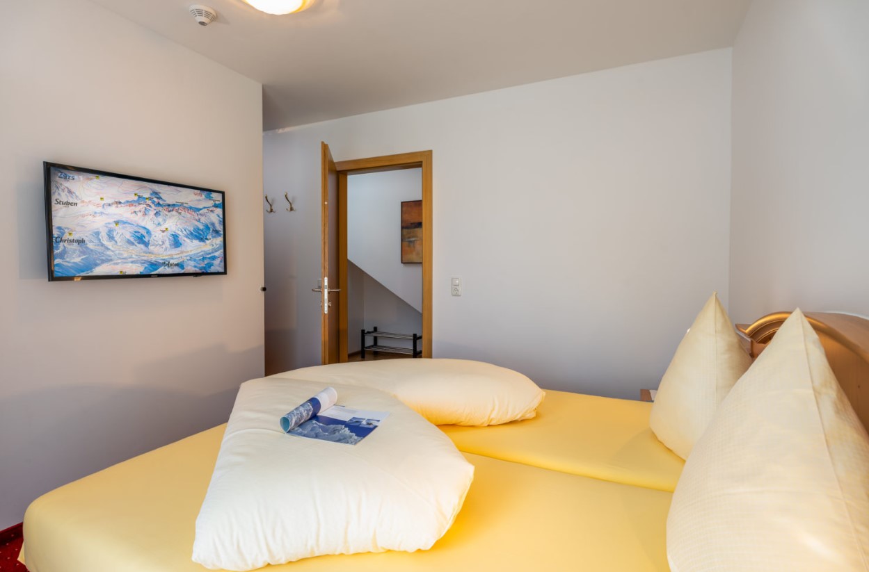 Just 300 metres from the piste and the gondola with direct access to best, largest and most snow sure ski area of Austria. Easily close to the very lively centre of St Anton, après-ski, sunny terraces, ski school, nursery slopes and ski hire shop where you can also leave your skis and shoes. Alternatively, the free ski bus stops closeby at 50 metres from this ever-popular chalet. All eight bedrooms have its own full en-suite bathroom with shower or bath, WC, basin, flatscreen TV and except only one all with balcony. All beds are divan beds and they can set apart and together. Chalet Belmonte is the epitome of a modern Tyrolean chalet. It has been built to our specification with modern furnishings throughout, without losing a sense of Austrian charm and style. The accommodation is bright and spacious spread across three floors. The ground floor living room has comfy sofas to lounge on, a large flatscreen TV, a guests kitchen area (your chalet staff don’t cook in this kitchen) and the sizeable sunny balcony/terrace here is ideal for enjoying tea in the late afternoon sun overlooking the pistes. The top floor dining room has the added bonus of a comfy sofa area and is perfect for hosting the evening meal with views of the resort as your back-drop. It is an excellent chalet for groups because of the ample living space and similarity of all the bedrooms. There is a heated ski room with boot dryers/warmers at the entrance or store your skis with a discount at the ski hire shop at the end of the piste. If you travel by car there is a free private underground parking to leave your car save. Positioned in a tranquil location at the end of a cul de sac and hardly any traffic, children can play safely here in the snow. Your chalet staff live out, so your privacy is completely guaranteed.