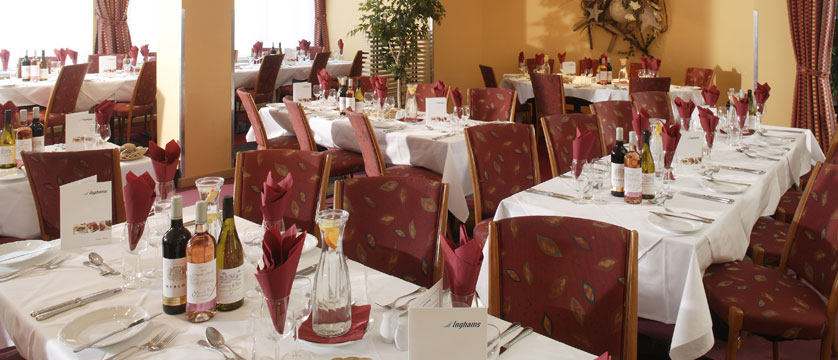 ‘Culinary Choice’ Dinner – Our Chalet Hotels make dinner a highlight of the day, with our 4-course menus served six days each week, accompanied by a choice of complimentary quality wines. Dinner starts with canapés and an apéritif, generally served in the lounge / bar, followed by a starter, main course, & dessert or cheese selection to finish. We offer choices for each course, always including a vegetarian option, and ask that you make your selection at breakfast each day, so that our chef’s team can prepare everything fresh for you that evening. Dinner can be as sociable or as private as you wish, with larger tables for groups of friends, old or new, or private tables for more intimate dining for couples if preferred. Vegetarian options are always available to choose from our menus, and other special diets can be catered for at a supplement, if booked with us in advance.