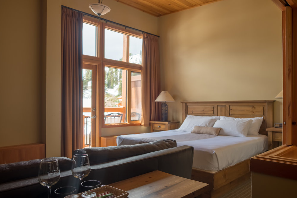 • West Wing Premiere Room (max. 4 people): 1 Queen bed + Queen murphy (wall) bed, gas fireplace, full bathroom, private balcony, stunning mountain views.