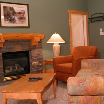 The units at the Cornerstone are beautifully set up for families and couples. All units feature a living area with gas fireplace, sofa bed and a balcony, plus there's a fully equipped kitchen and dining area.