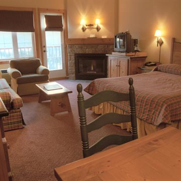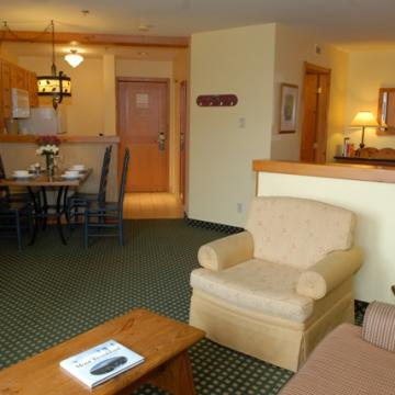 1 Bedroom Suite: separate bedroom with 1 Queen bed, living room with sofa bed, kitchen, fireplace