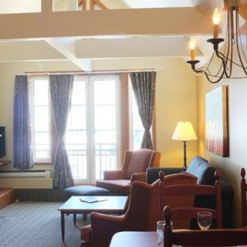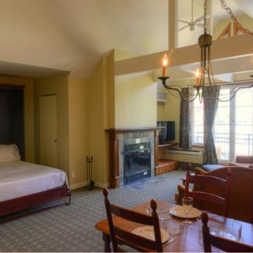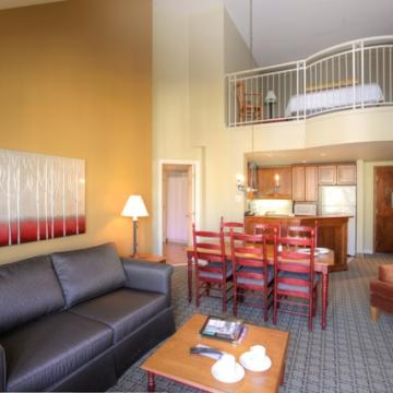 1 Bedroom Loft Suite: separate bedroom with 1 Queen bed and loft bedroom with 1 Queen bed, sofa bed in living area, kitchen, fireplace and 2 bathrooms