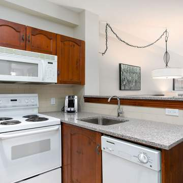 Hotel Rooms are beautifully furnished and come with a variety of bedding configurations. Studios and Suites all have fireplaces, fully equipped kitchens plus one bathroom per bedroom.