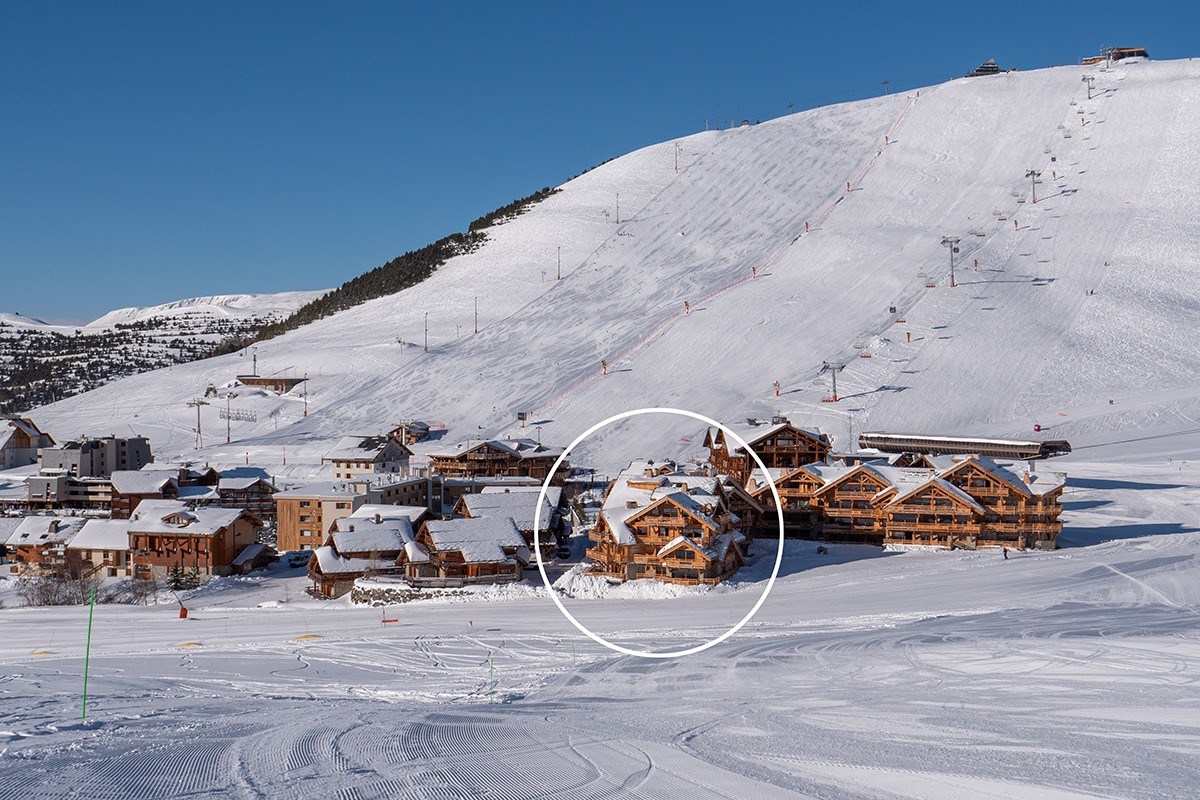A unique position at the top of the resort overlooking the pistes, lifts and nursery slopes and just 100m from the shops, bars and restaurants. Nearest lift is the DMC bubble, just across the piste.
