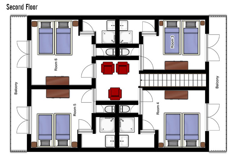 • All five bedrooms have a shower and wash basin in an alcove that's separated from the bedroom by a curtain. The WC is separate and have a door.