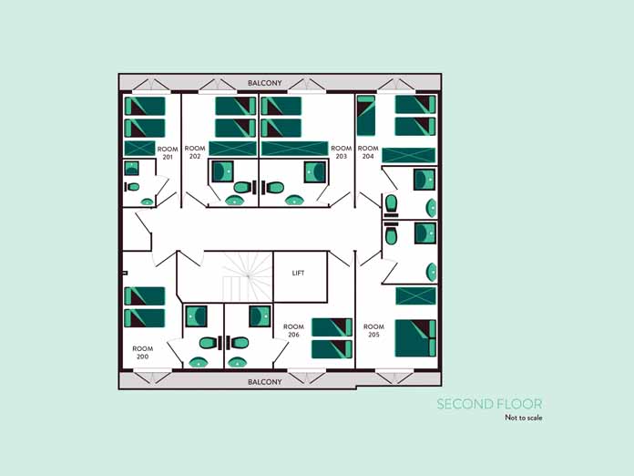 second floor: 5 twin rooms with shower, WC and balcony. Double room with shower, WC, Double room with shower, WC and balcony.