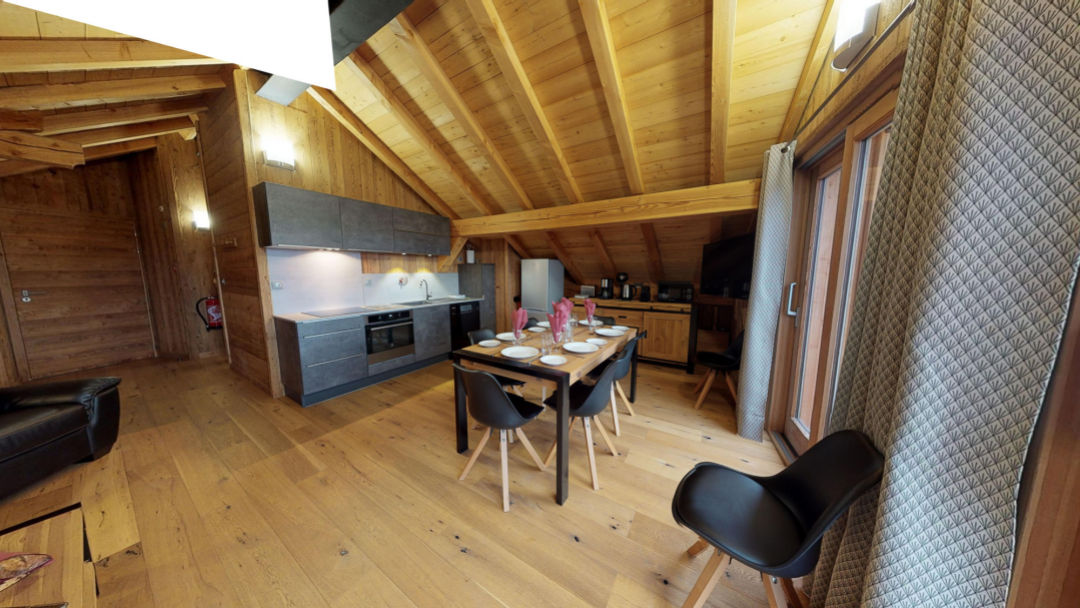 On the first floor you'll find the open plan living room, kitchen and dining space. The room is light and airy, with high vaulted ceilings in the eaves of the building. Outside of the living space is a large balcony from which there are stunning views of the surrounding mountains and a great spot to enjoy an apres-ski drink if the weather is kind to you. The dining table and sitting room areas have ample space for 6-7 guests to sit comfortably. The kitchen is modern and stylishly finished, and comes fully equipped with an oven, four-ring induction hob, dishwasher, fridge, freezer, microwave, kettle, toaster, Nespresso machine and coffee percolator, so you'll have everything required to rustle up a stunning meal for your friends and family.
