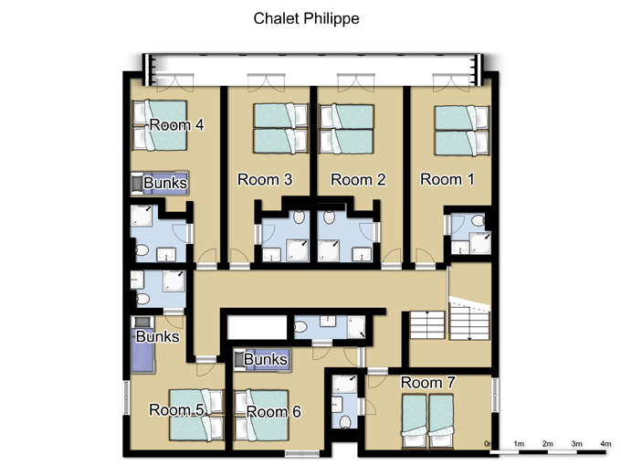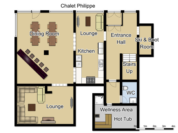 The entrance to Chalet Philippe is on the ground floor. There is an internal staircase connecting the two chalets (which is normally locked) and this can be opened for groups taking both chalets Christian and Philippe and arrangements can be made to eat dinner together in Philippe's spacious dining room.