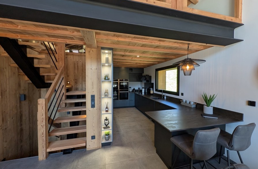 The double aspect open plan lounge/dining area with a large central fireplace, flat screen TV and Sonos system makes Chalet Sika perfect for families and groups to relax. And with the addition of the huge 60m2 (floor area) mezzanine above with comfortable seating as well as a bistro table football, it’s the perfect chalet for large groups to all relax and have fun. There is also a bonus room downstairs with comfy relaxed seating to watch a movie or play on the PlayStation 5 – a perfect escape for kids.
