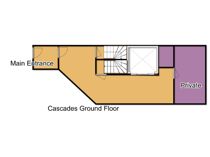 • Entrance, lift to all floors. Ski-hire shop and owner's café bar (separate entrances)