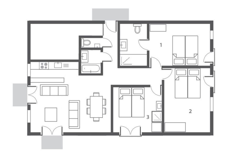There are three bedrooms, each can be arranged as a double or twin, one with an en-suite bathroom and two (one with en suite shower) that share a family bathroom and WC.