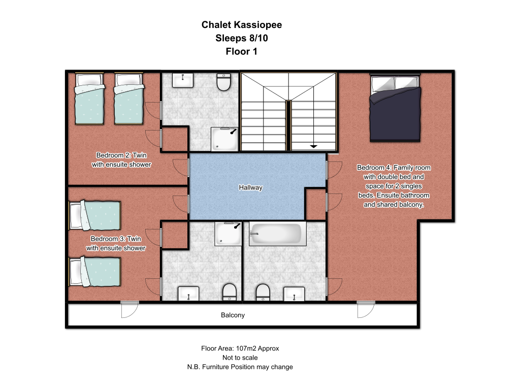 Entrance to the chalet is on the ground floor, where you’ll find a bedroom with two single beds and en-suite bath room and toilet. The second bedroom is on the first floor, again with two single beds and en-suite shower room and toilet. The remaining three bedrooms can be found on the second floor, of which two have balconies, one with three single beds, en-suite bathroom and toilet and the other two bedrooms each two single beds and an en-suite shower rooms and toilet. All of the bedrooms are spacious, comfortable and attractively furnished, with modern touches that compliment that traditional Alpine architecture.