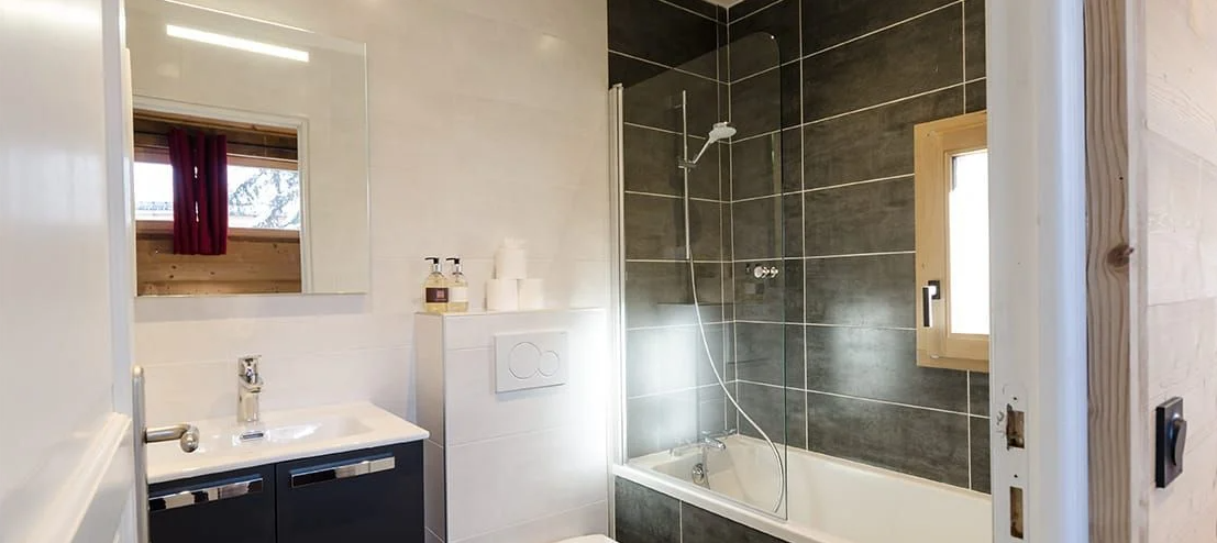 Bedroom 7 - Twin with en-suite bath and overhead shower, toilet and heated towel rail with views overlooking the Tarentaise valley