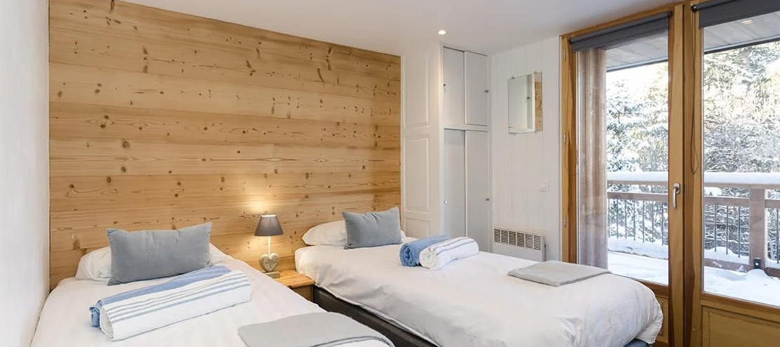 Bedroom 8 - Twin with en-suite overhead shower, toilet and heated towel rail with views overlooking the Tarentaise valley