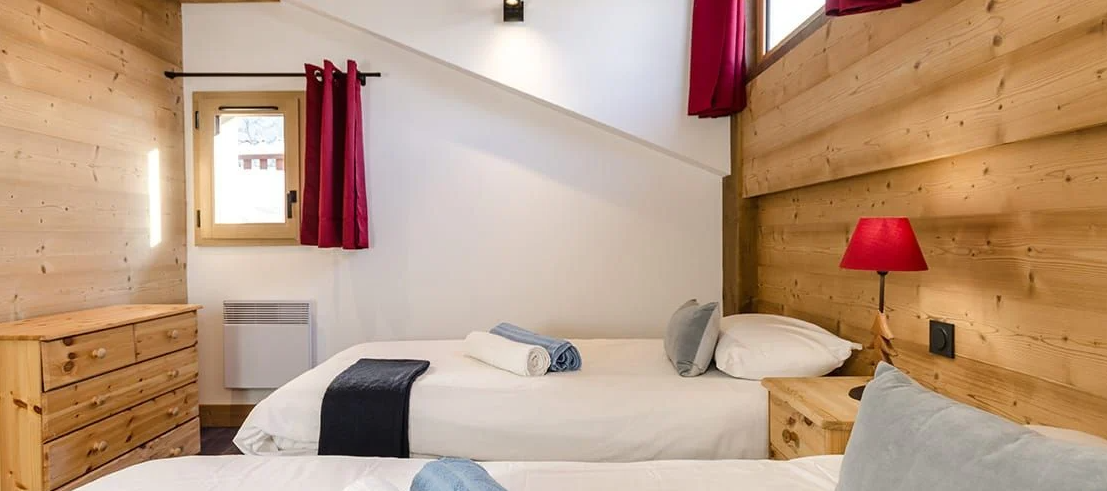 Bedroom 6 - Twin with en-suite shower, toilet and heated towel rail with views overlooking the Tarentaise valley