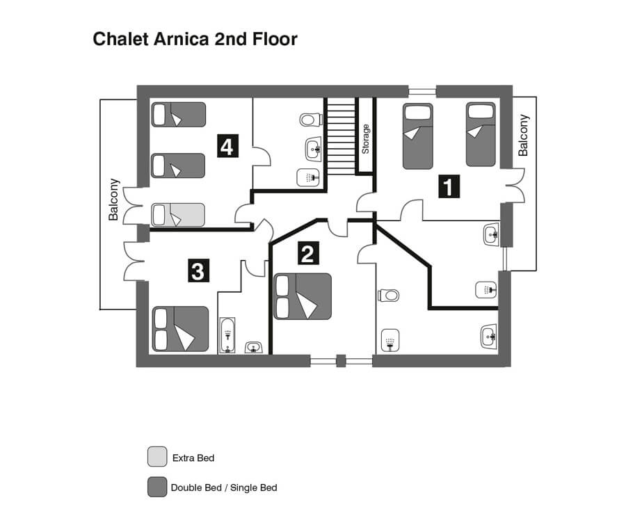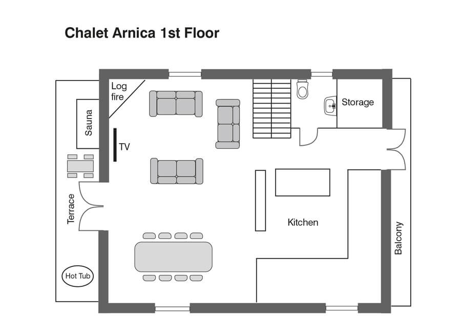 Chalet Arnica can sleep up to 9 people, is laid out over 3 floors with boot and ski storage at the entrance. Stairs up to the first floor where there is a spacious living/dining area with open log fireplace, satellite TV, comfy sofas to lounge on and sunny terrace with a sauna and hot tub.
